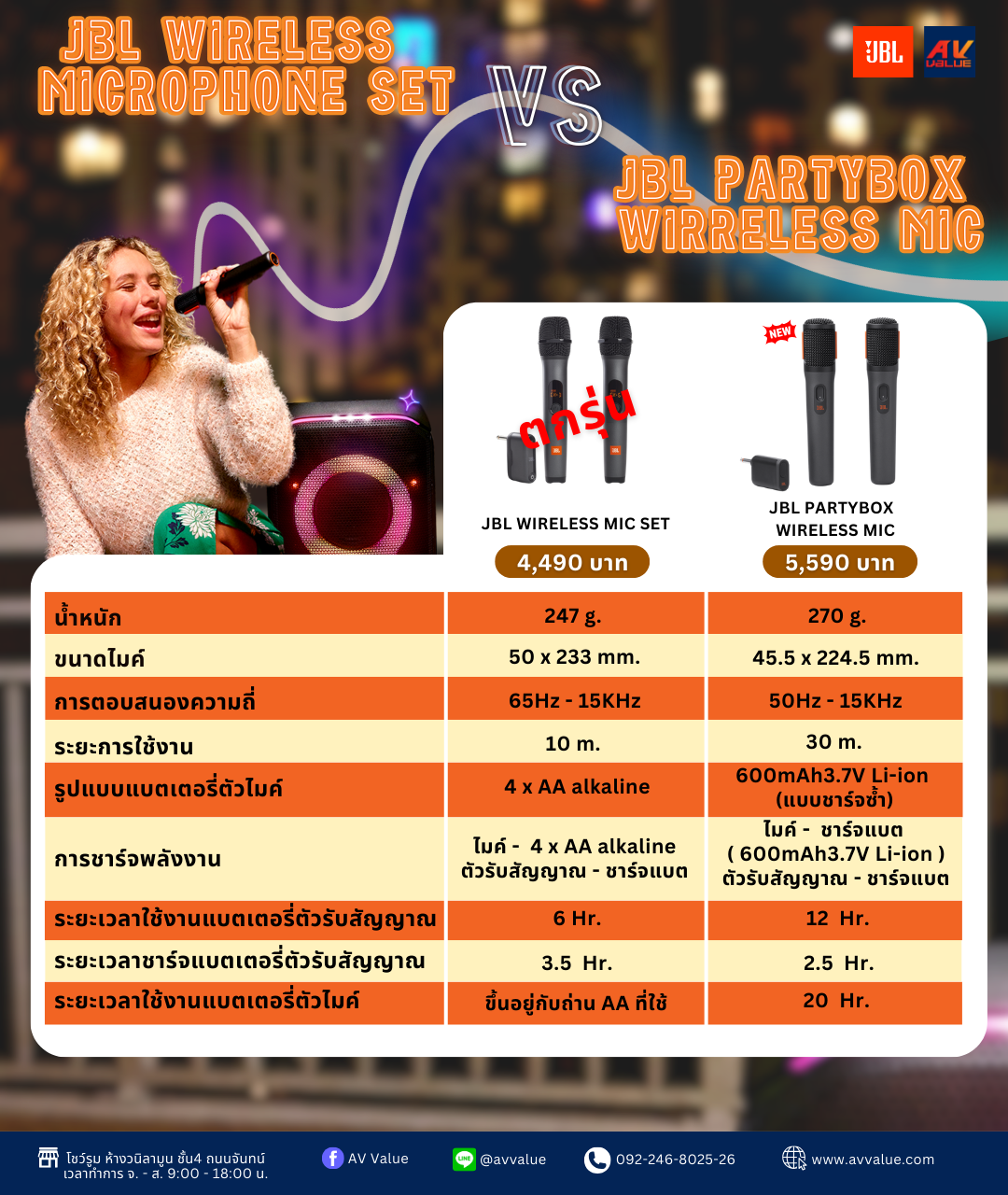 วันนี้เราจะมาเปรียบเทียบ "JBL Wireless Microphone Set" VS "JBL PartyBox Wireless Mic Set" กันครับ ว่าแตกต่างกันยังไงบ้าง ?