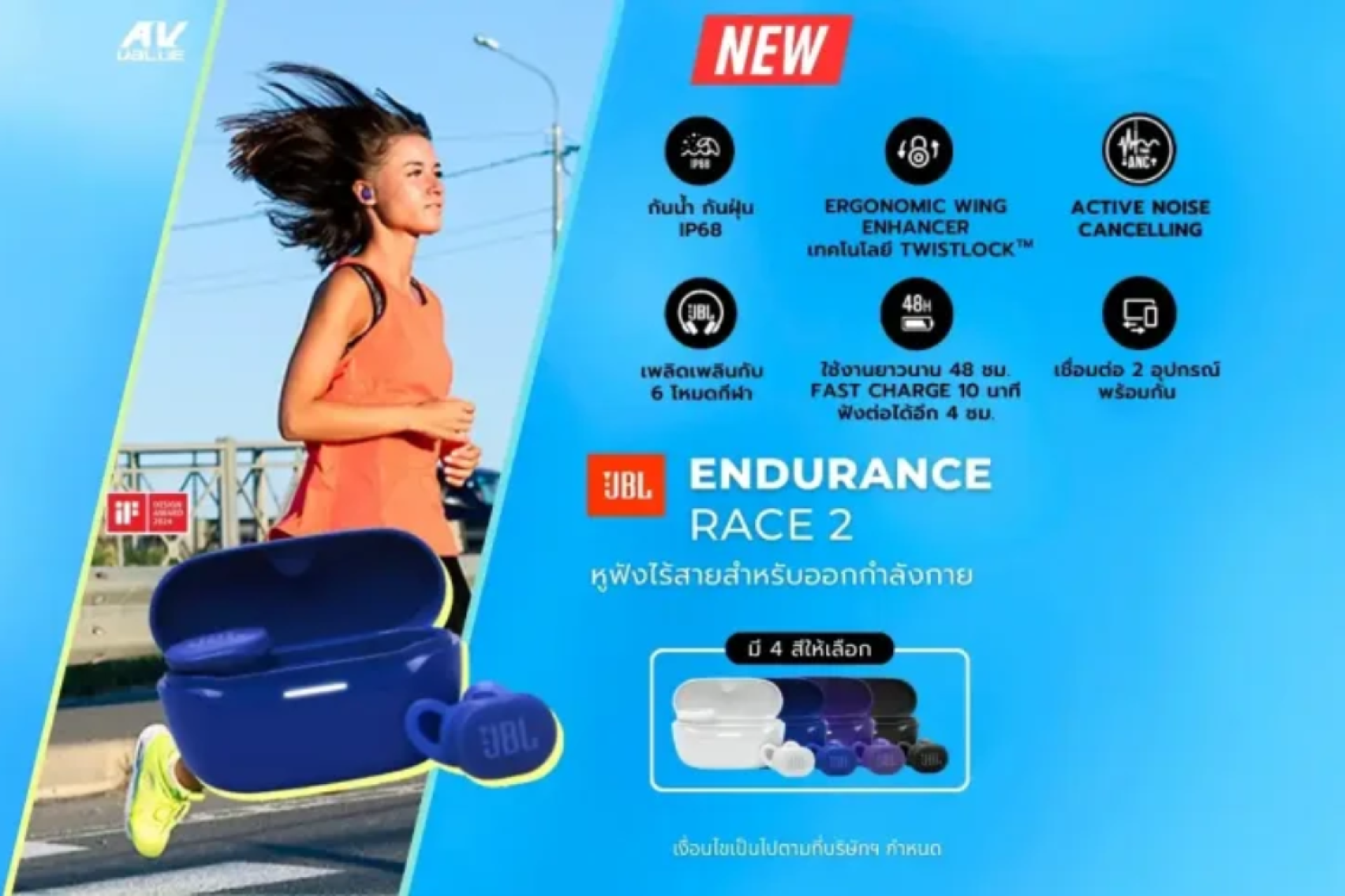 - JBL ENDURANCE RACE 2 หูฟังออกกำลังกาย มีจำนวน 4 สี ดังนี้ Black , Blue , Purple , White ราคา 4,490 บาท